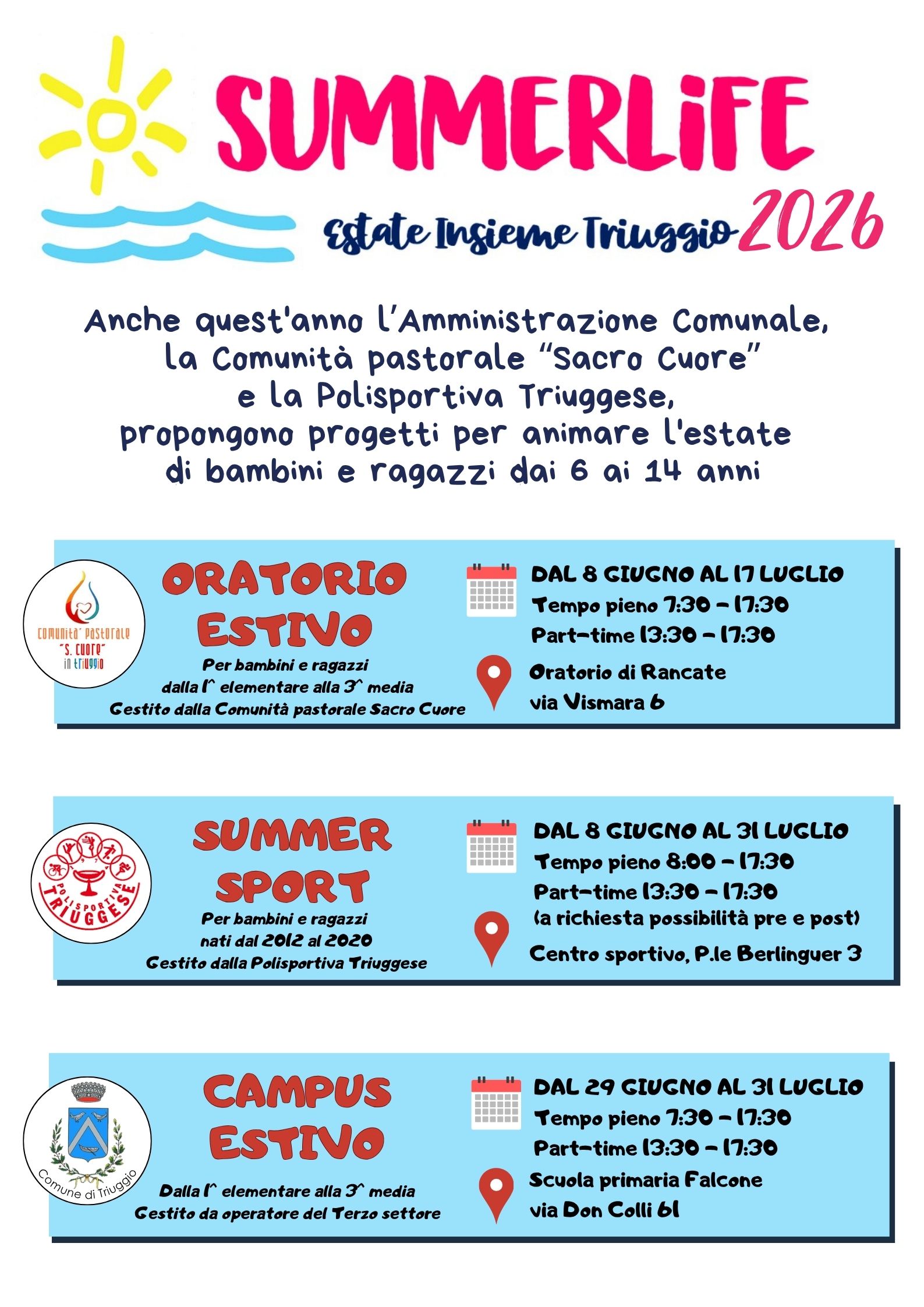 Anche quest’anno l’Amministrazione comunale, la Comunità pastorale Sacro Cuore e la Polisportiva Triuggese propongono progetti per per animare l’estate di bambini e ragazzi dai 6 ai 14 anni.