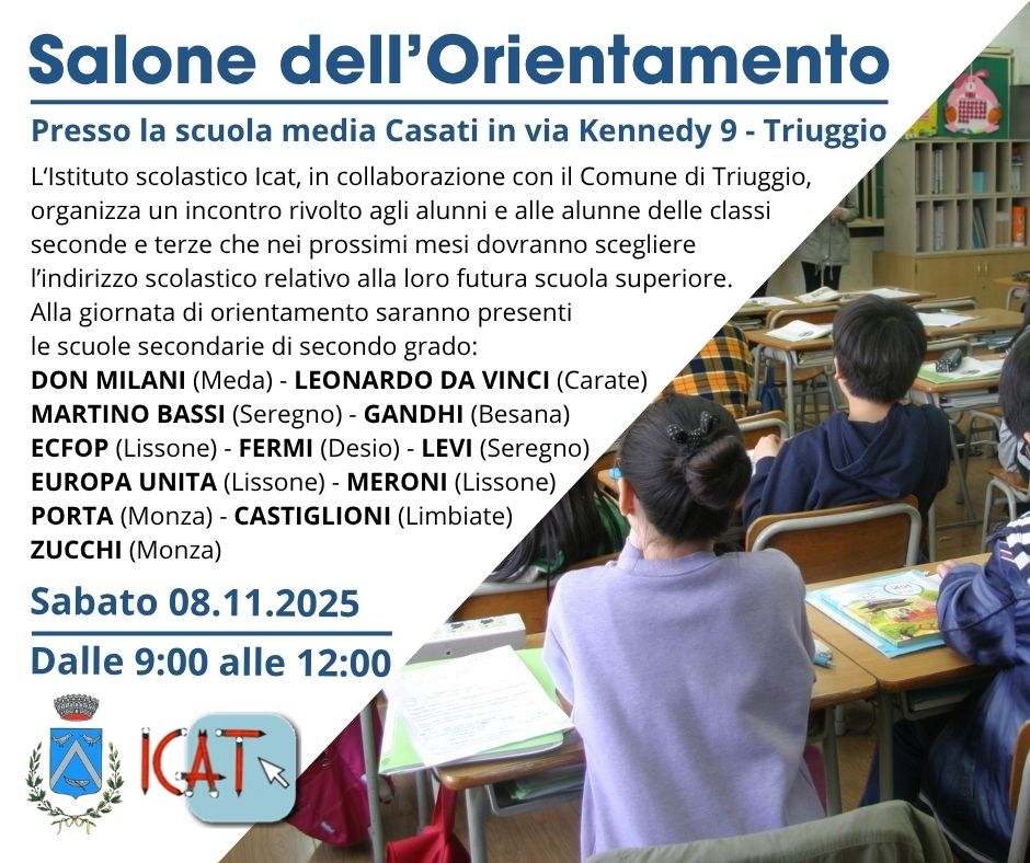 L’Istituto scolastico Icat, in collaborazione con il Comune di Triuggio, organizza un incontro rivolto agli alunni e alle alunne delle classi seconde e terze che nei prossimi mesi dovranno scegliere l’indirizzo scolastico relativo alla loro futura scuola superiore.