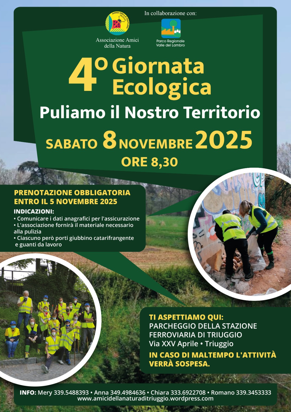 L’Associazione Amici della Natura, in collaborazione con il Parco Valle Lambro, organizza per sabato 8 novembre 2025 la quarta giornata ecologica dell’anno: i partecipanti verranno divisi in squadre che per tutta la mattinata si dedicheranno alla pulizia di alcune zone del territorio.