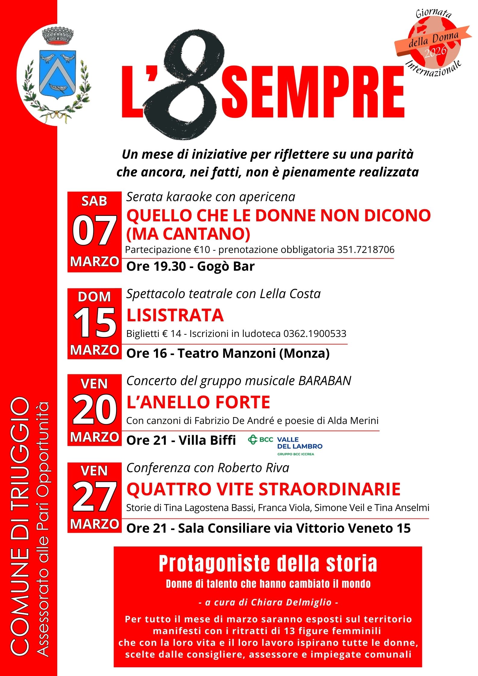 La rassegna si concluderà venerdì 27 marzo, alle 21 in sala consiliare, con la conferenza “Quattro vite straordinarie”, a cura di Roberto Riva che narrerà le storie di donne che hanno lasciato un segno nella storia come Tina Lagostena Bassi, Franca Viola, Simone Veil e Tina Anselmi.