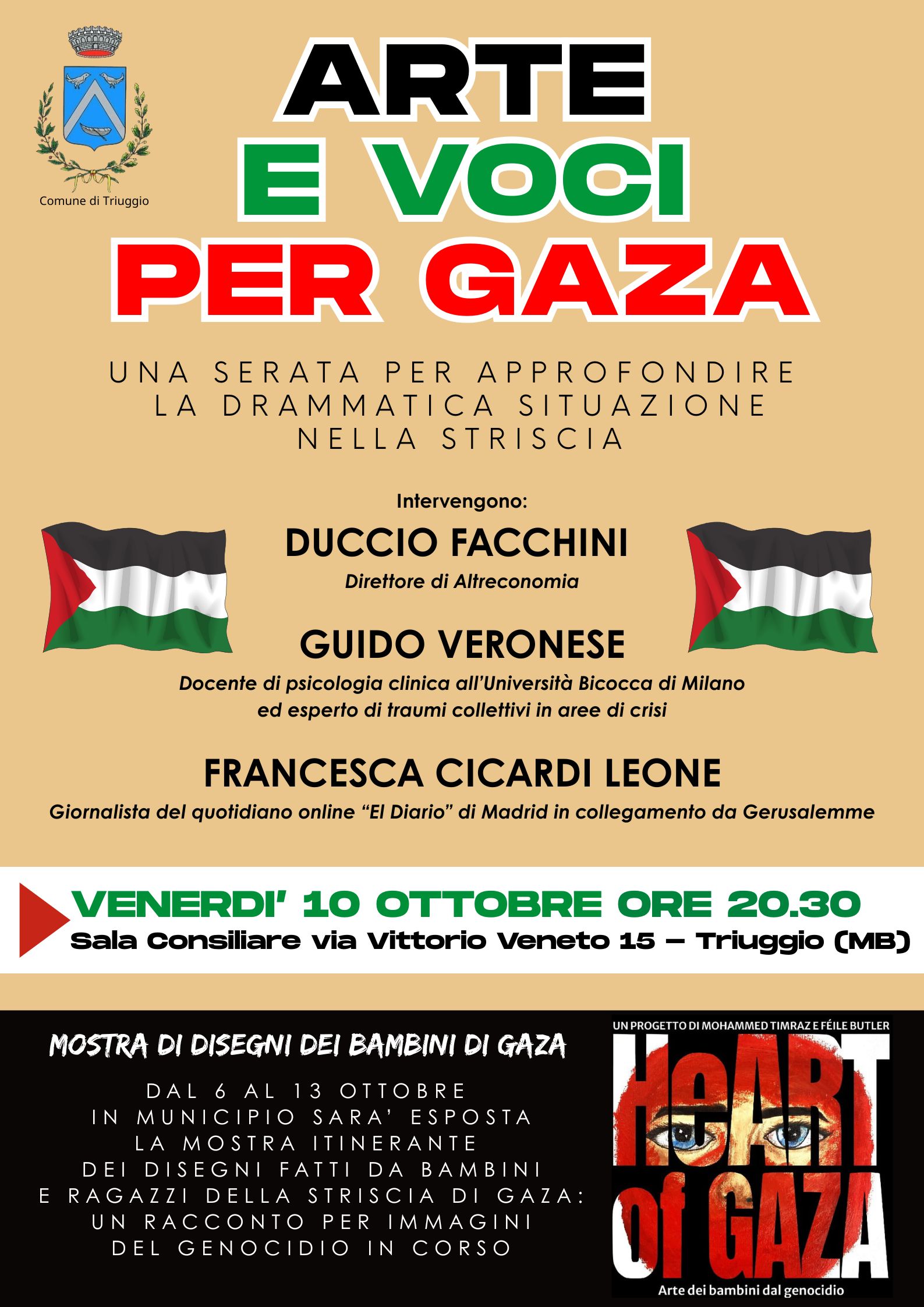 Sarà inoltre possibile visitare la mostra “heART of Gaza”, che sarà allestita dal 6 al 13 ottobre in municipio: si tratta di una mostra itinerante, che sta facendo il giro del mondo, dei disegni fatti da bambini e ragazzi di Gaza che raccontano con le immagini la drammatica esperienza che stanno vivendo e il genocidio in corso.