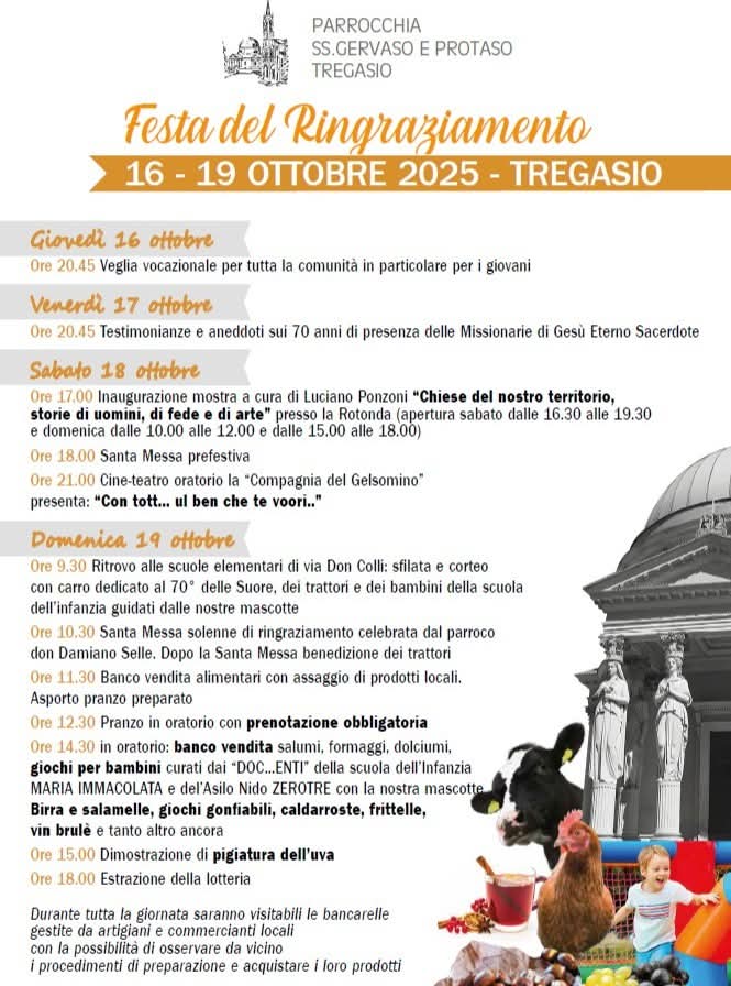 La parrocchia dei Santi Gervaso e Protaqso di Tregasio organizza anche quest’anno la Festa del Rigraziamento: un weekend di eventi religiosi e ludico ricreativi con mostre alla Rotonda, banchetti e spettacoli teatrali in oratorio, sfilata di carri e trattori per le vie del paese.