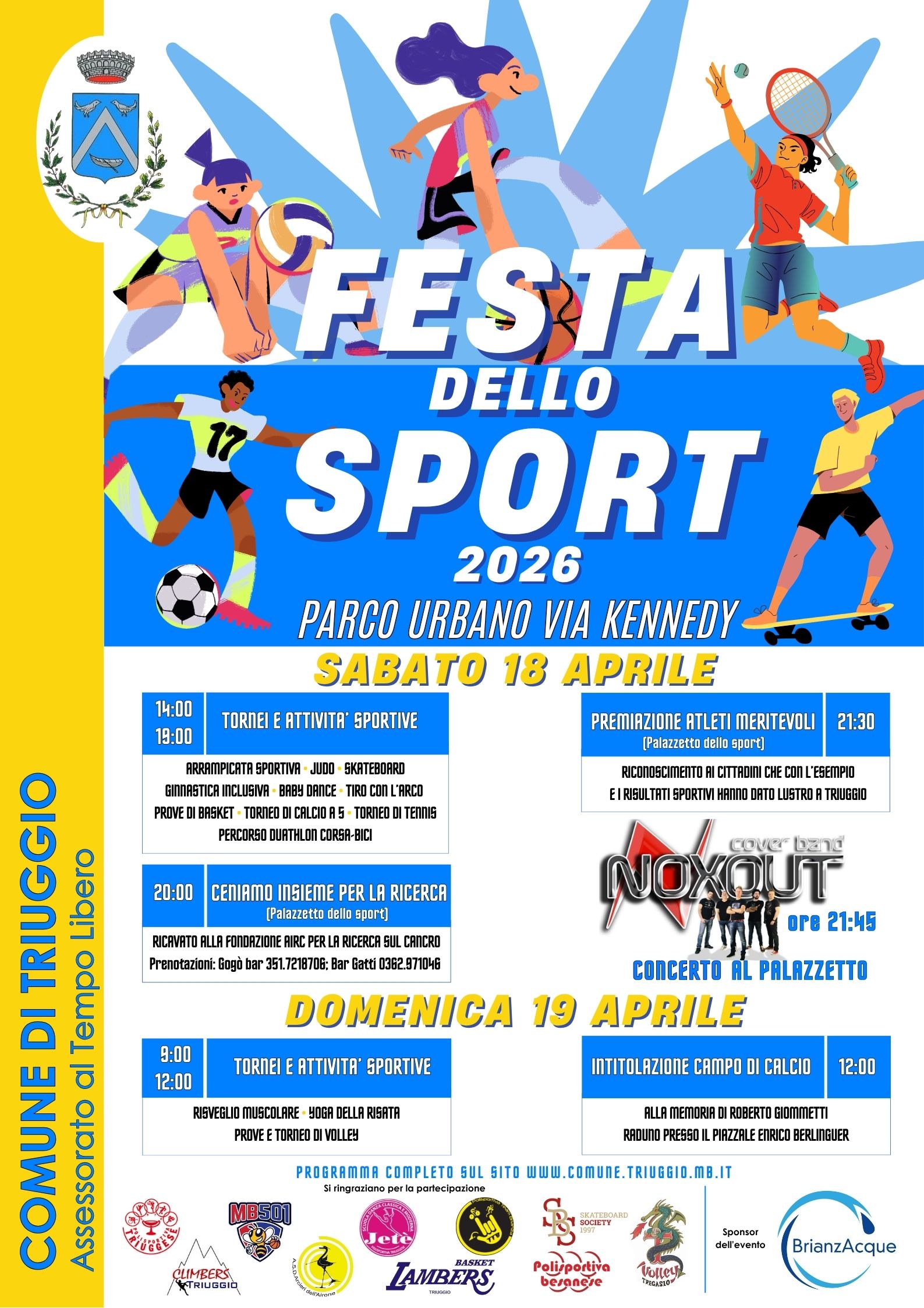 La “Festa dello Sport 2026”, che si svolgerà sabato 18 e domenica 19 aprile 2026, si pone l’obiettivo di promuovere la pratica e i valori dello sport, l’attività delle associazioni locali e l’offerta di attrezzature e impianti sportivi sul territorio, in particolare tra la popolazione giovanile.