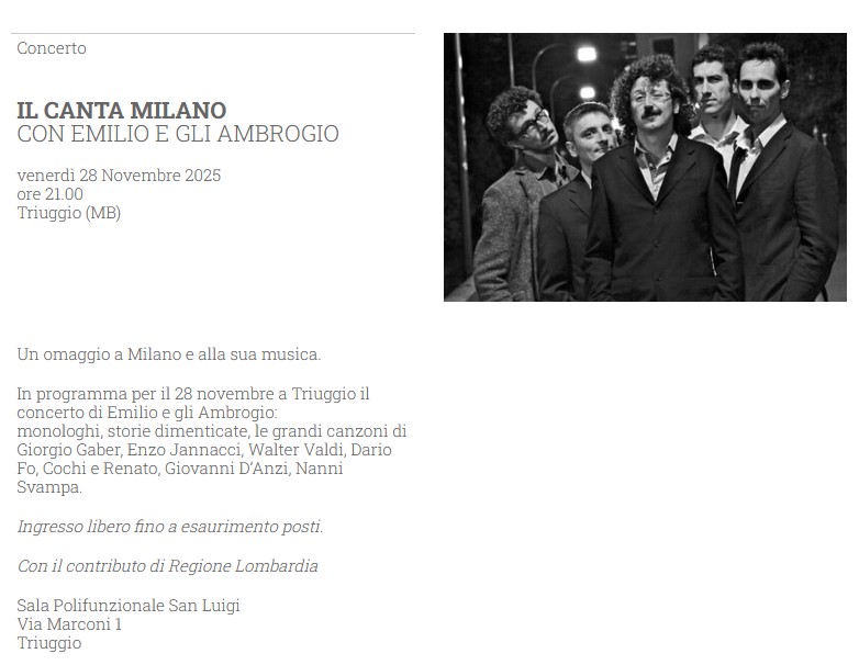 Il Consorzio Villa Greppi organizza un omaggio a Milano e alla sua musica. Venerdì 28 novembre a Triuggio, presso la sala polifunzionale San Luigi in via Marconi, andrà in scena il concerto della band Emilio e gli Ambrogio: uno spettacolo in cui si alterneranno monologhi, storie dimenticate, le grandi canzoni di Giorgio Gaber, Enzo Jannacci, Walter Valdi, Dario Fo, Cochi e Renato, Giovanni D’Anzi, Nanni Svampa.