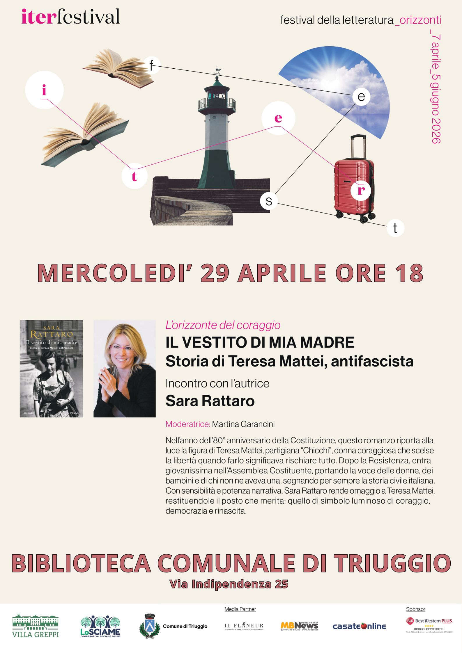 La presentazione e il laboratorio sono rivolti a bambini 8-15 anni: iscrizione obbligatoria entro il 16 aprile via mail: attivitaculturali@villagreppi.it - Mercoledì 29 aprile, ore 18:00: Sara Rattaro presenta il libro “Il vestito di mia madre”, storia dell’antifascista Teresa Mattei.
