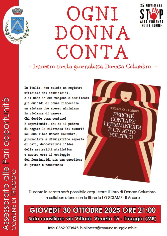 Giovedì 30 ottobre in sala consiliare incontro con la giornalista Donata Columbro che presenterà il suo libro "Perché contare i femminicidi è un atto politico".