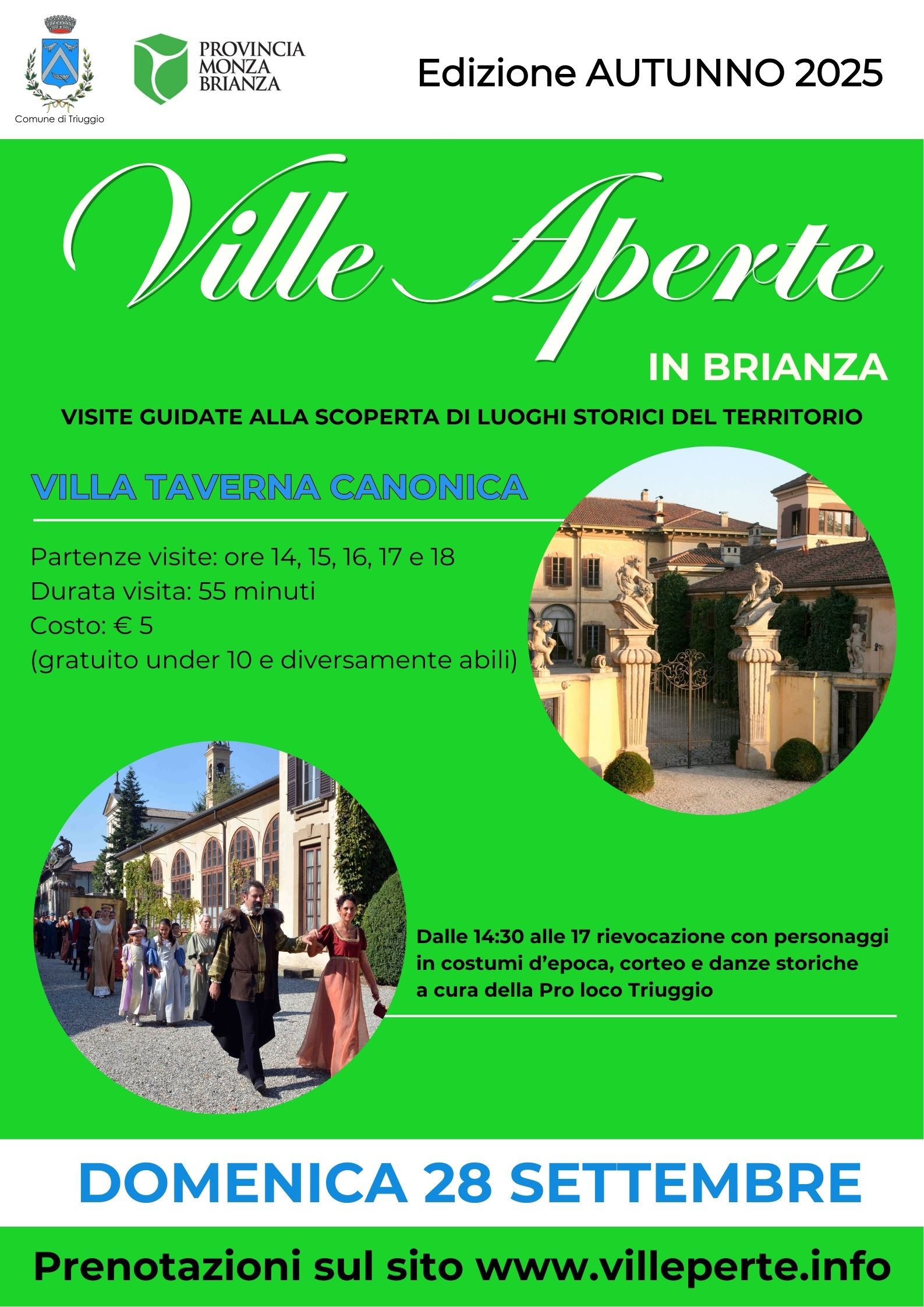 La nuova edizione della manifestazione Ville Aperte si svolgerà domenica 28 settembre 2025 nella classica stupenda cornice di Villa Taverna a Canonica con visite guidate ogni ora dalle 14 alle 18 (partenze ore 14, 15, 16, 17, 18) al prezzo di € 5 (dagli 11 anni – gratuito per diversamente abili e relativo accompagnatore).